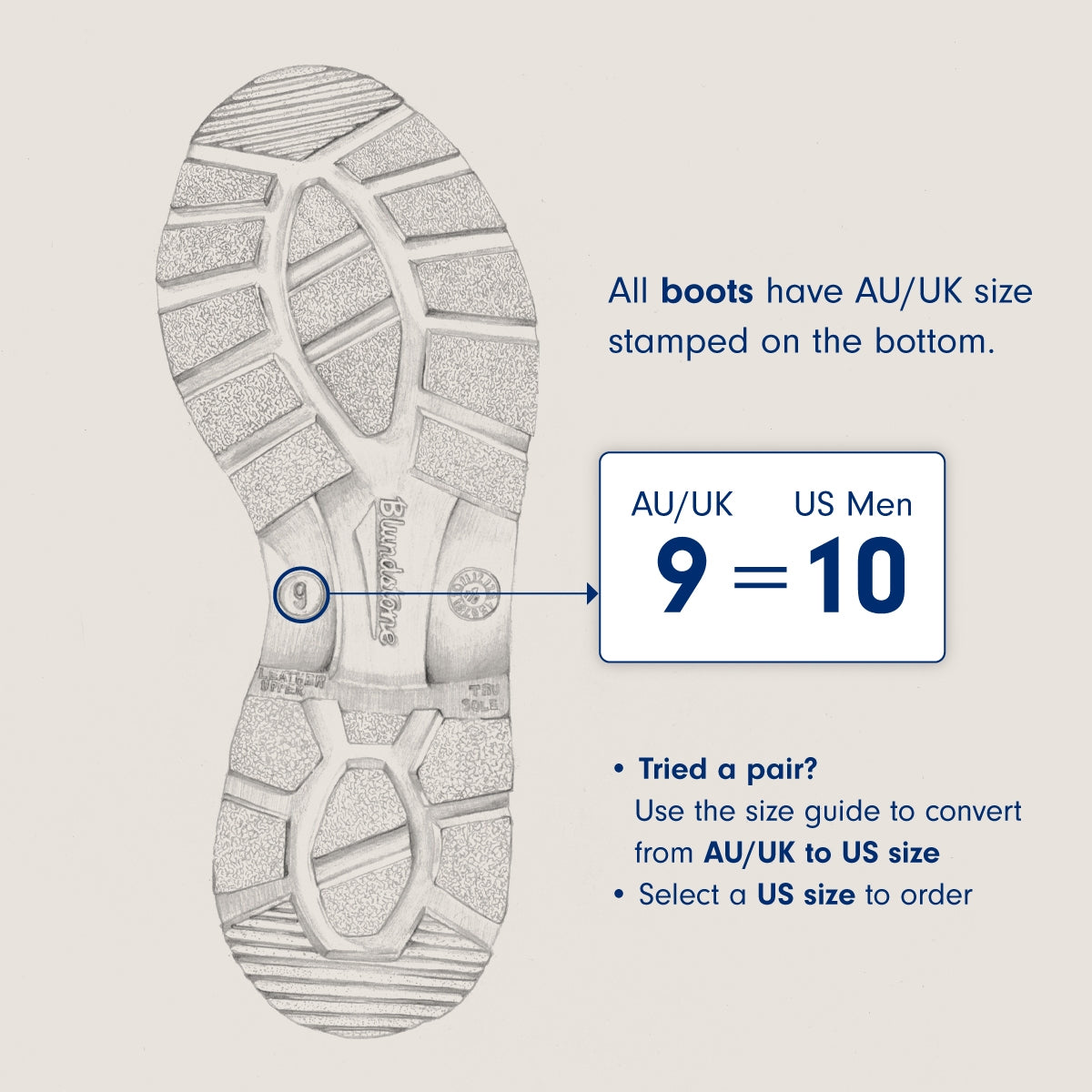 Blundstone shoes are listed in UK sizing. For women's sizes, add 3 to the UK size. For men's sizes, add 1 to the UK size.